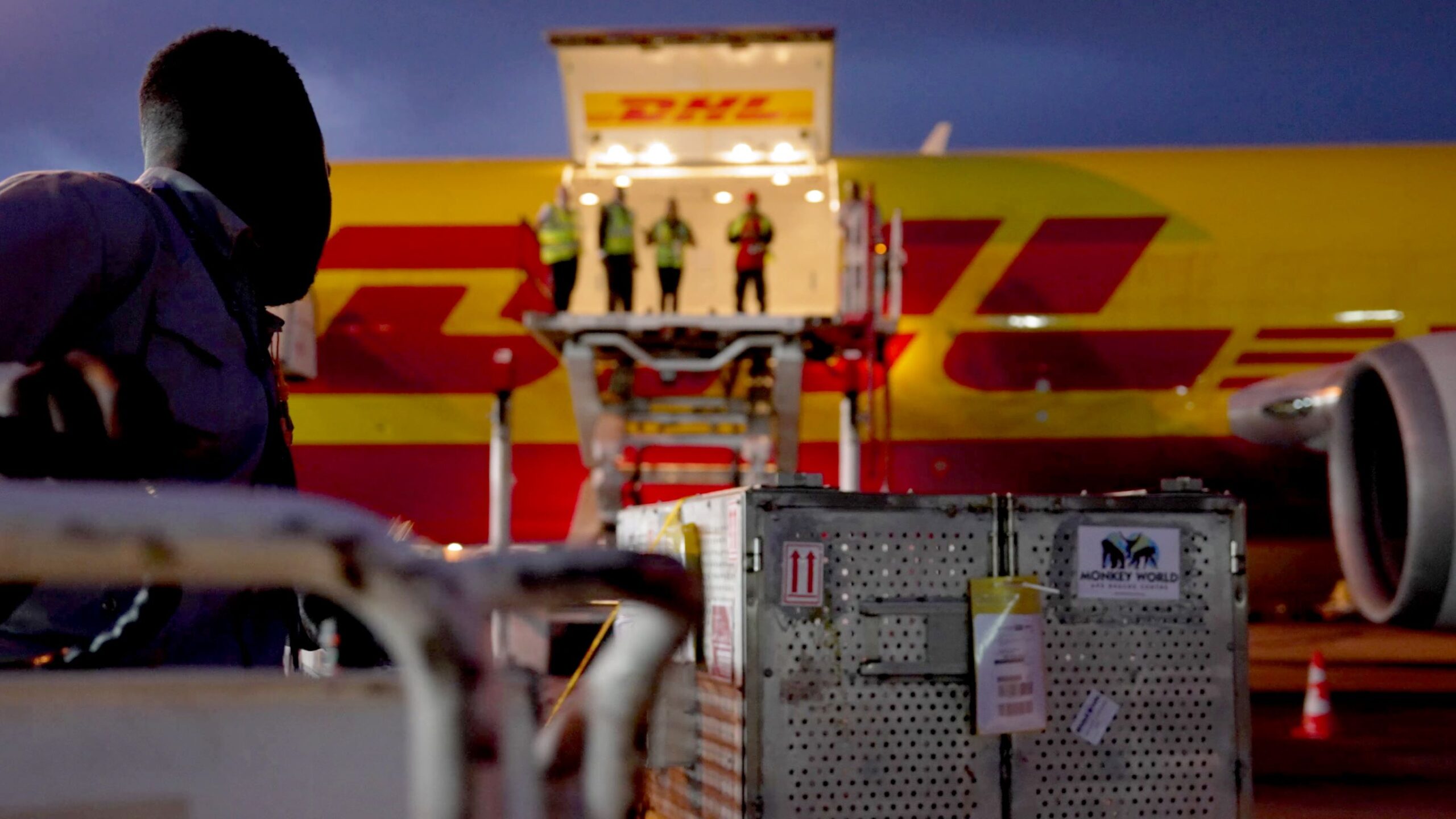Em agosto de 2024, a chimpanzé Chocolat foi transportada pela DHL desde o Quénia para o Monkey World Ape Rescue Centre em Dorset, no Reino Unido. Foi salva em bebé, em 2001, após ter sobrevivido ao comércio ilegal de carne de animais selvagens no Congo, onde caçadores furtivos mataram a mãe. Chocolat sofreu ferimentos provocados por balas de caçadeira, que a deixaram paralisada num mão e numa pata. Durante mais de duas décadas foi tratada no Quénia, mas precisava de um lar permanente que lhe pudesse prestar os melhores cuidados possíveis. Assim, a DHL tratou desta viagem como um transporte de alta prioridade. Começou com um voo de Nairobi para o aeroporto de East Midlands, no Reino Unido, e terminou com uma viagem de carro até Dorset. Para garantir conforto e segurança, foi feita uma caixa à medida de Chocolat. Hoje vive com outros seis chimpanzés.
