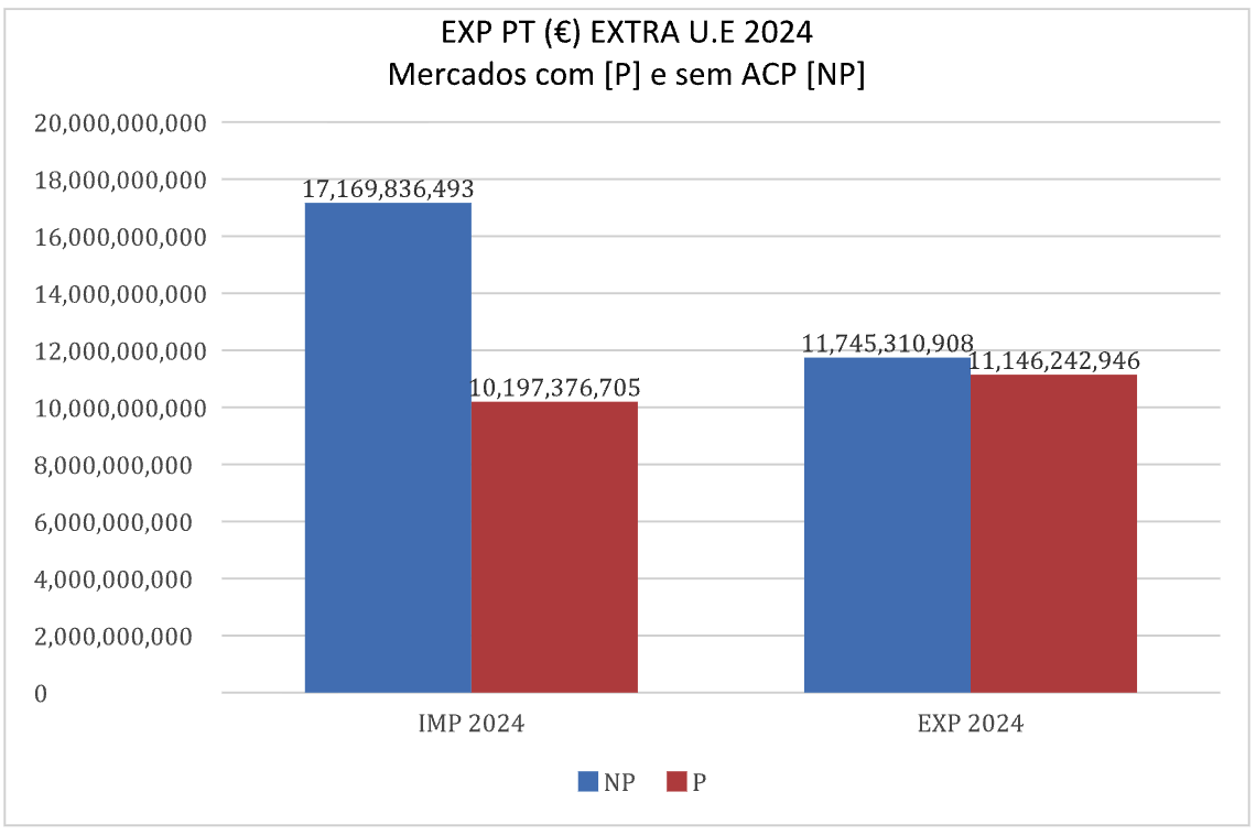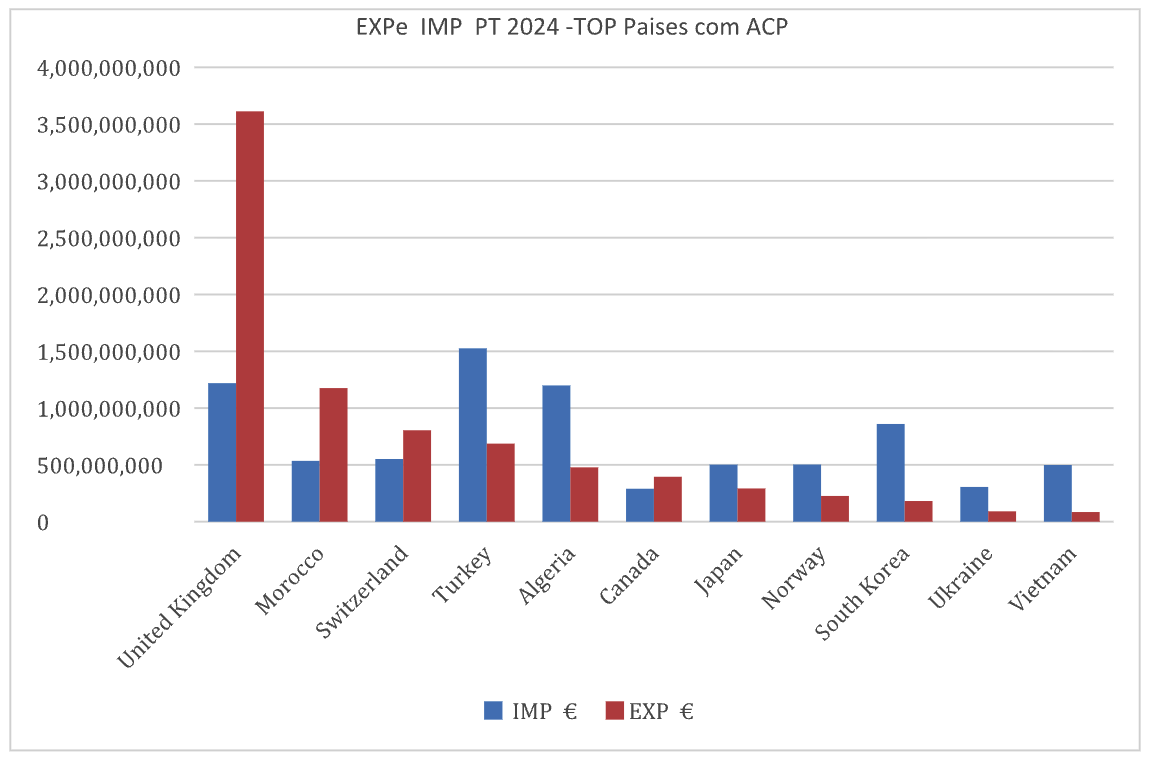 Do lado das exportações, o Reino Unido lidera destacado entre os destinos Extra UE com ACP, seguido de Marrocos, Suíça e Turquia; Canadá e México surgem logo a seguir, sinalizando potencial transatlântico. Nas importações, a Turquia é a principal origem Extra UE sob ACP, seguida de Reino Unido e Argélia; Coreia do Sul, Japão e Vietname reforçam a âncora asiática. Estes rankings ajudam a priorizar esforços comerciais e a desenhar políticas de origem e compliance orientadas para mercados com escala e tração setorial.
