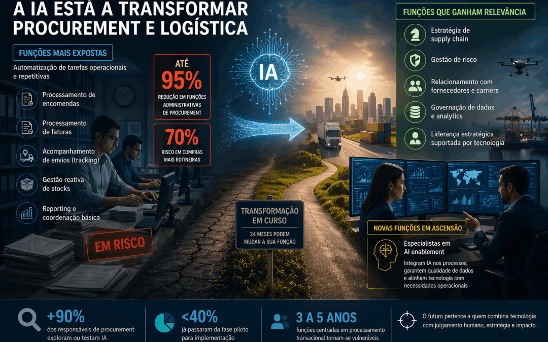 A inteligência artificial está a acelerar a transformação do trabalho nas áreas de procurement e logística, com impacto direto em funções operacionais e repetitivas. Segundo um artigo publicado pelo portal The Chain, organizações mais avançadas poderão reduzir até 30% dos postos de trabalho transacionais num horizonte de 24 meses, enquanto cresce a procura por perfis estratégicos e orientados a dados.